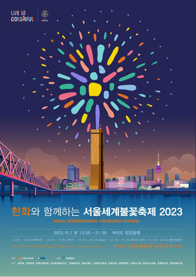 서울세계불꽃축제는 한화그룹이 지난 2000년부터 사회공헌사업으로 진행중인 대규모 축제로 매년 10월 여의도 한강공원에서 개최된다. 올해는 10.7.(토)에 ‘Lights of Tomorrow’를 주제로 한국을 비롯한 중국, 폴란드 등이 참여하여 관람객들에게 잊지 못할 가을밤의 추억을 선사할 예정이다. 불꽃 연출은 오후 7시 20분부터 8시 30분까지, 70분간 진행된다.