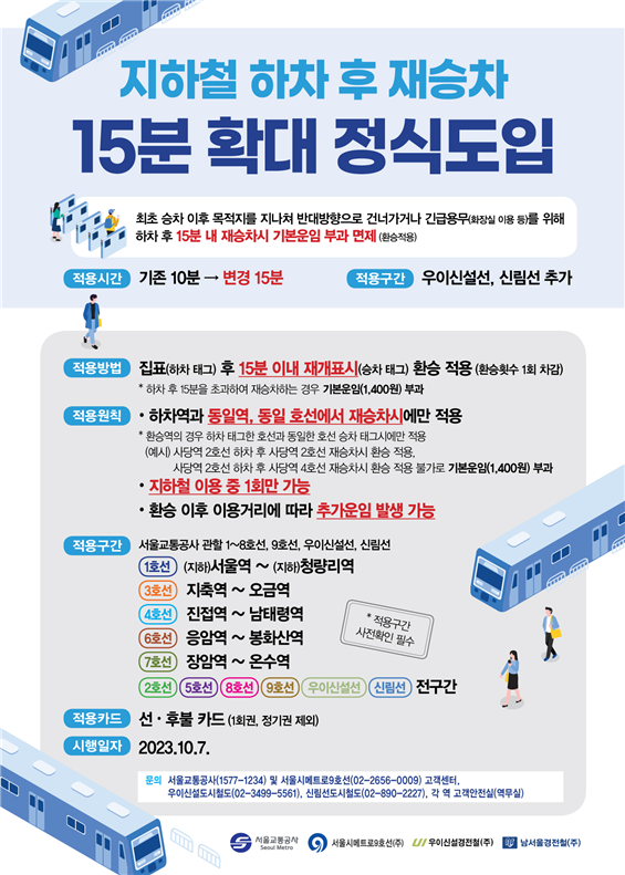 또한 기존 1~8호선(서울교통공사 운영구간) 및 9호선 구간에만 적용됨으로 인하여 발생했던 시민 불편을 줄이고 시민혜택을 확대하기 위하여 서울시 관할 민자 경전철인 우이신설선 및 신림선에도 ‘15분 재승차’ 제도를 전면 도입한다.