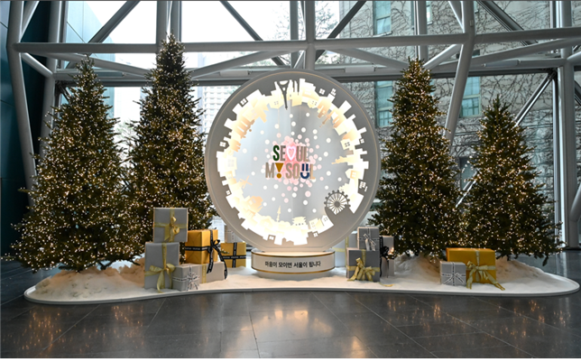 원형 조형물 주변에는 반짝이는 조명으로 장식된 크리스마스 트리와 신규 브랜드 로고를 활용한 선물 상자 등의 소품이 어우러져 있어 연말연시 시청사 방문객에게 따뜻한 분위기와 행복감을 전달한다.