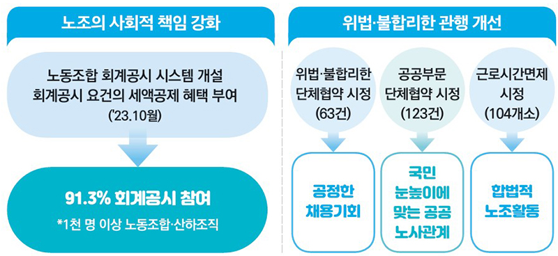 아울러 위법·불합리한 관행을 개선한 결과 공공부문 단체협약은 123건 시정했고 근로시간면제를 통해 합법적 노조활동을 보장하고 있다.