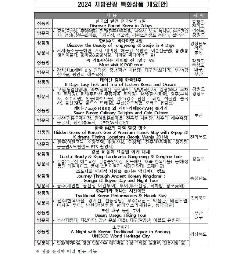특히 케이팝과 식음, 전통, 자연, 치유, 등산 등을 소재로 우리나라의 지역 곳곳의 매력을 느낄 수 있는 일정들로 구성했다.